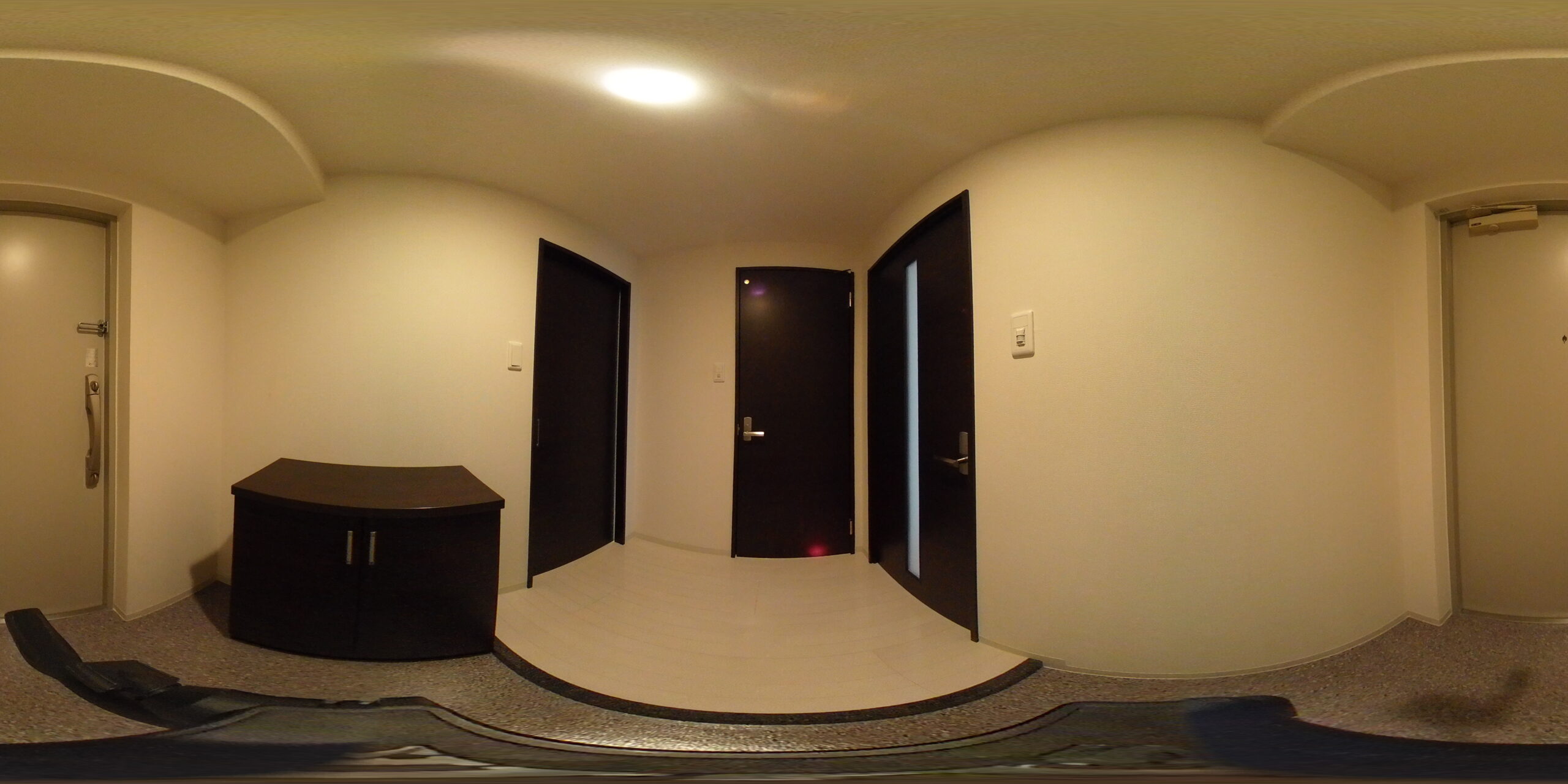 室内へ。白い壁にダーク調のキッチンと扉。